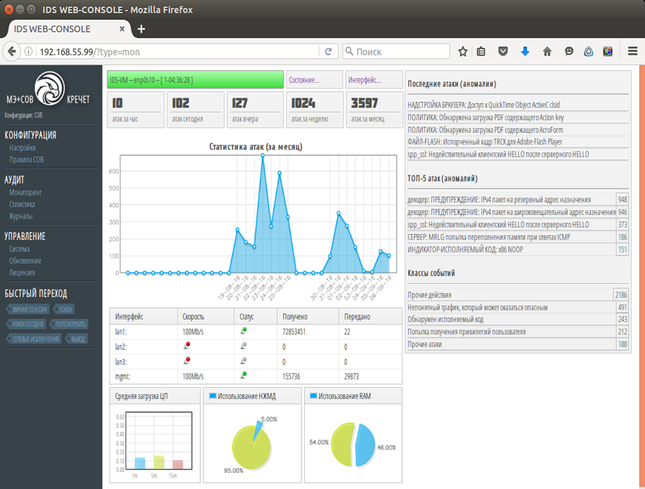 СОВ "Кречет" предназначен для выявления всех известных видов сетевых атак.